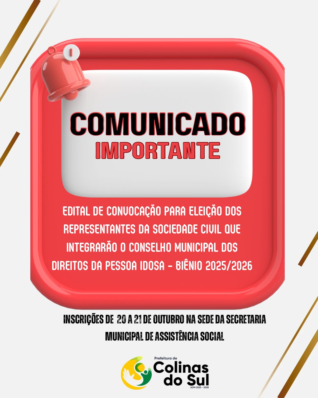 O Conselho Municipal dos Direitos da Pessoa Idosa de COLINAS DO SUL – Goiás, no uso de suas atribuições legais conferidas pela Constituição Federal, Lei Federal nº 8.742/93 (LOAS) e a Lei Municipal nº 513 de 08 de novembro de 2021, convoca as Entidades Prestadoras de Serviços e Representantes de Usuários da Assistência Social, todas no âmbito do município de COLINAS DO SUL, para participarem da eleição para escolha dos novos Conselheiros municipais, representantes da Sociedade Civil, para cumprirem mandato no biênio de 2025 a 2026, observando as disposições constitucionais e demais normas aplicáveis.